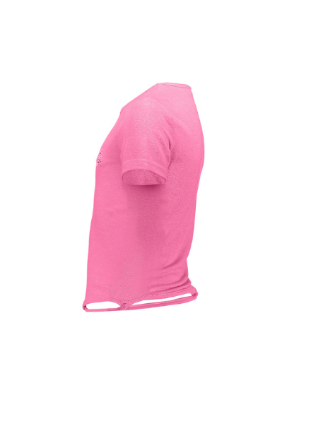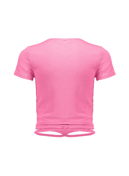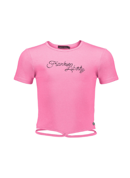Stretch roze t-shirt met Frankie & Liberty logo voorop, rondom de onderkant zit een touwtje dit geeft een speels effect. Leuk te combineren op een kort broekje of jeans.