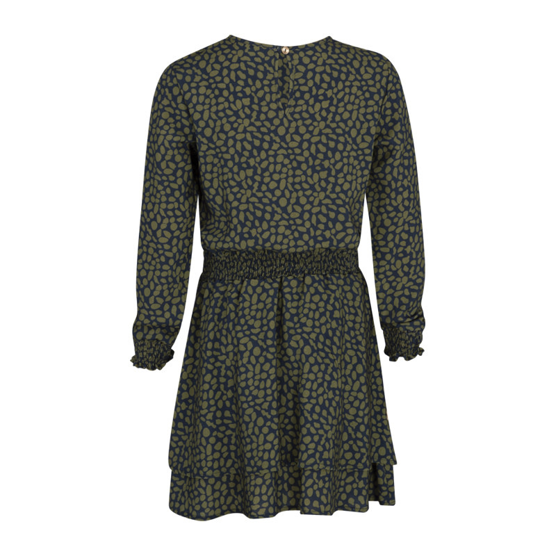 Super leuke groen jurk met print van Kie Stone. De jurk heeft een elastiekenband in de taille.