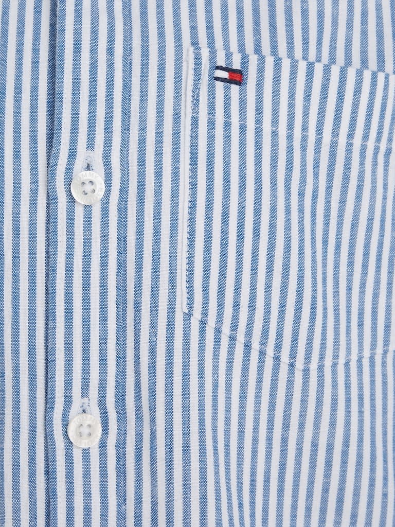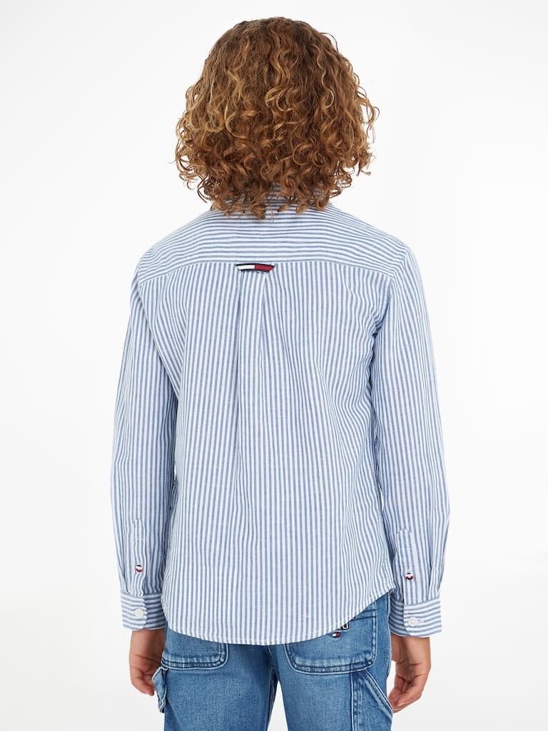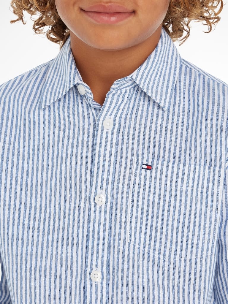 Mooie klassieke blauw wit gestreepte blouse van Tommy Hilfiger. De blouse heeft een knoopsluiting, zakje op de borst en aan de boordjes van de mouwen zit een knoopjes. De blouse heeft een normale pasvorm.