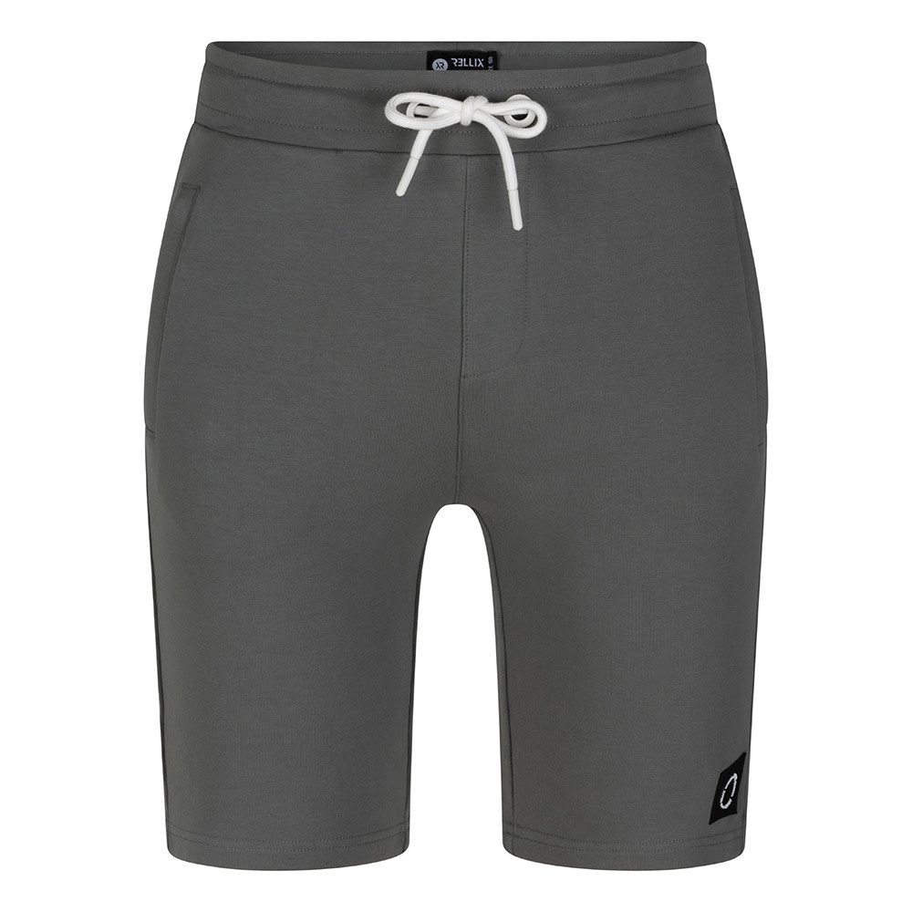 Stoere korte broek in fijne jogging stof van Rellix. De korte broek heeft een blinde zak op de achterkant, steekzakken en een elastieken band en koord in de taille.