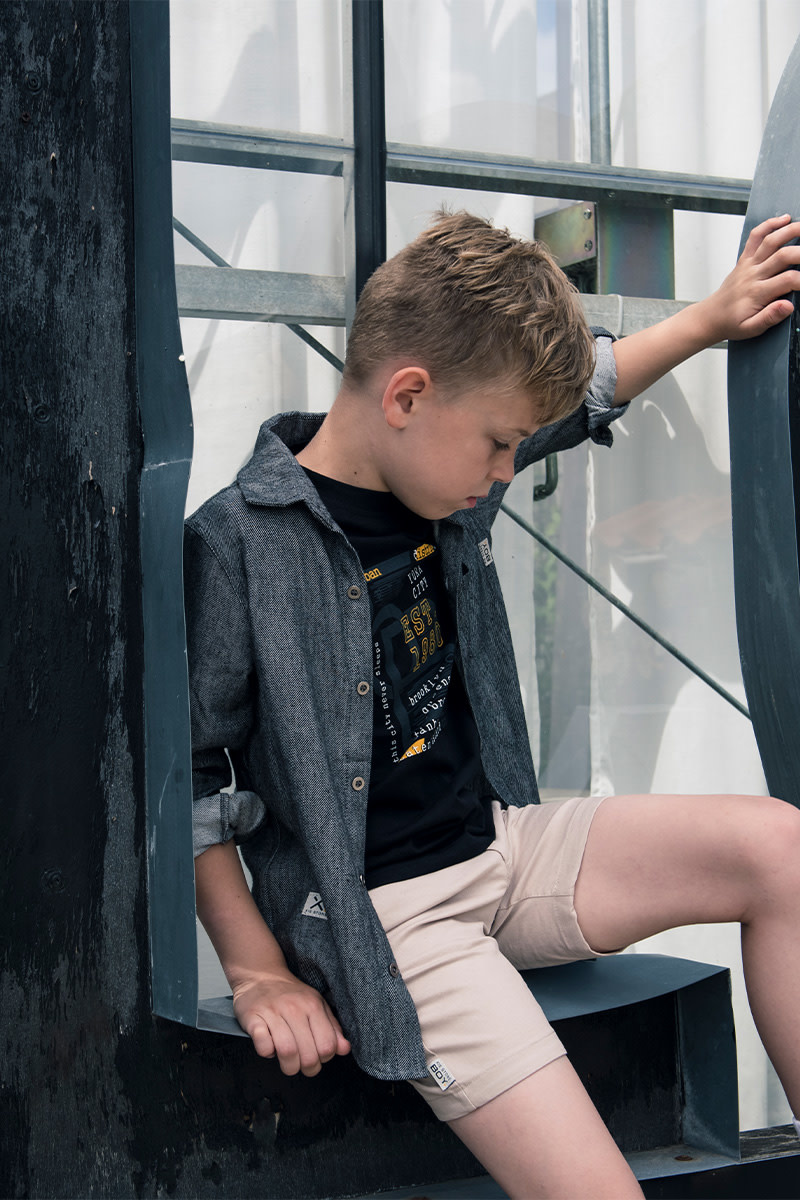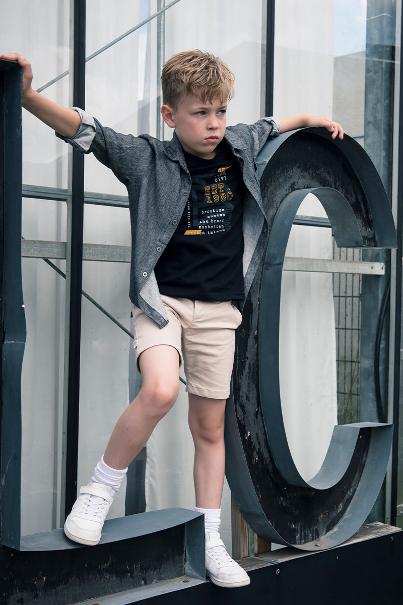 Mooie korte broek in pantalon stijl van KIE Stone Boy. De korte broek heeft steekzakken en een blinde zak op de achterkant. De band is verstelbaar.