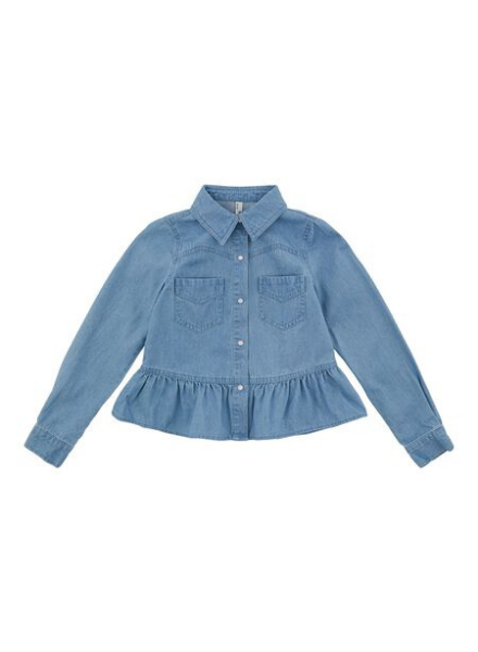 Een leuke girly denim blouse van Little Pieces. De onderkant van de blouse is voorzien van een ruffel rand. Leuk om deze blouse op een zwarte jeans te dragen en stoere boots eronder.