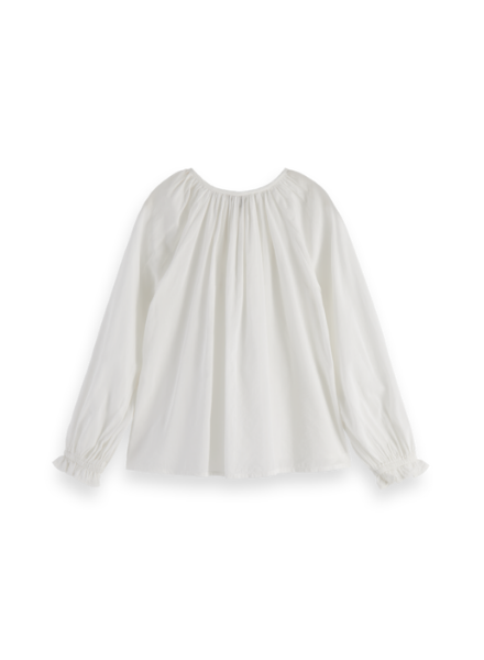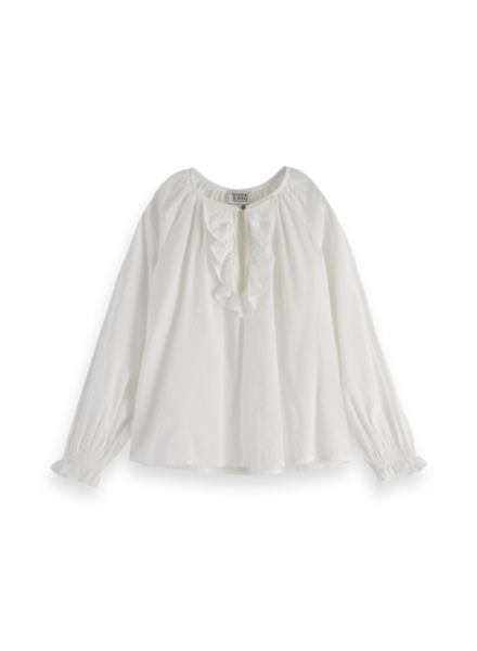 De Relaxed-fit ruffled top van Scotch & Soda. Deze top heeft ruffels op de borst en elastiek bij de polsen zodat deze mooi aansluit. Combineer de top op een stoer jeans of draag het met een leuke girly rok.